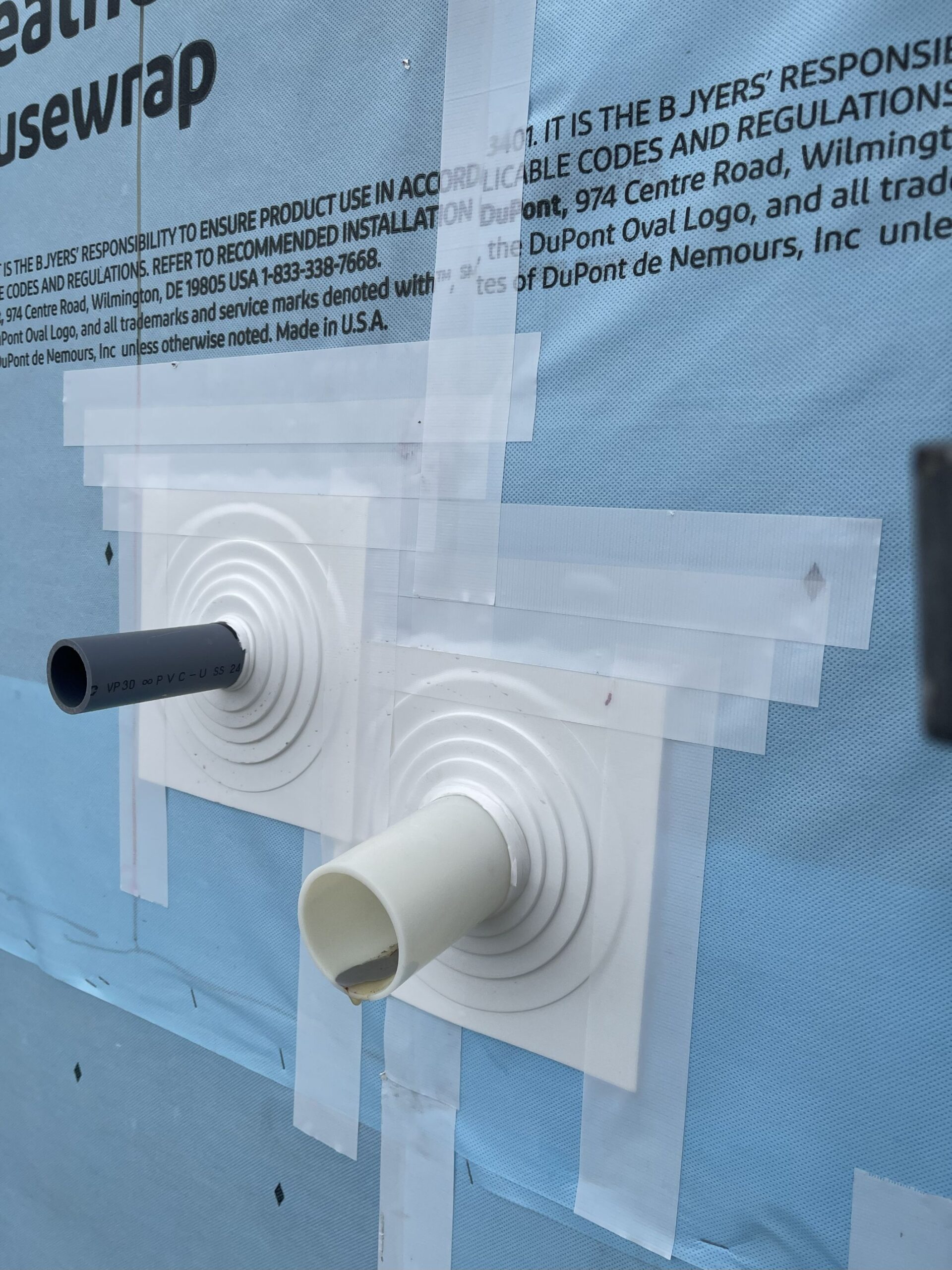 打ち込まれたプラスチックキャップが、ハウスラップの強い保持力と気密性を向上させ、ハウスラップを流れ落ちる雨水の構造躯体への侵入を防ぎます。
