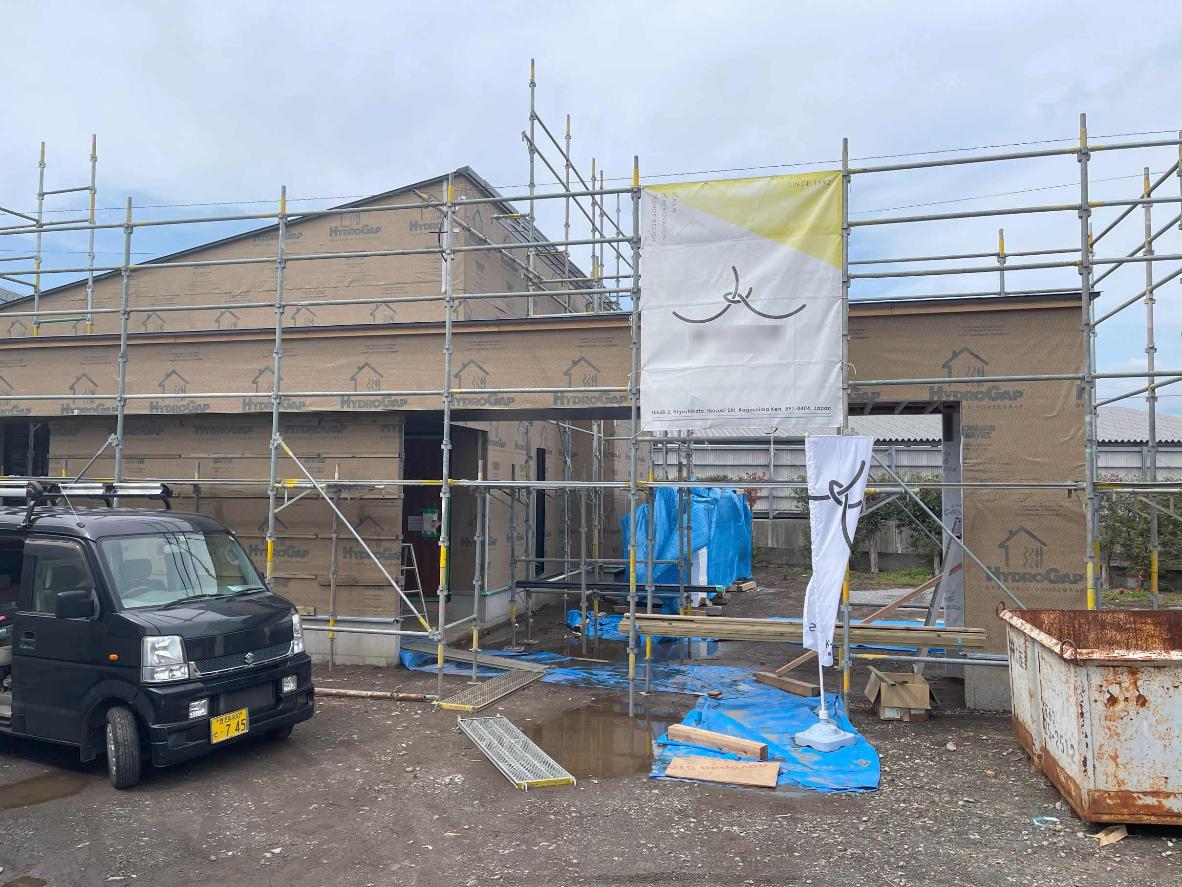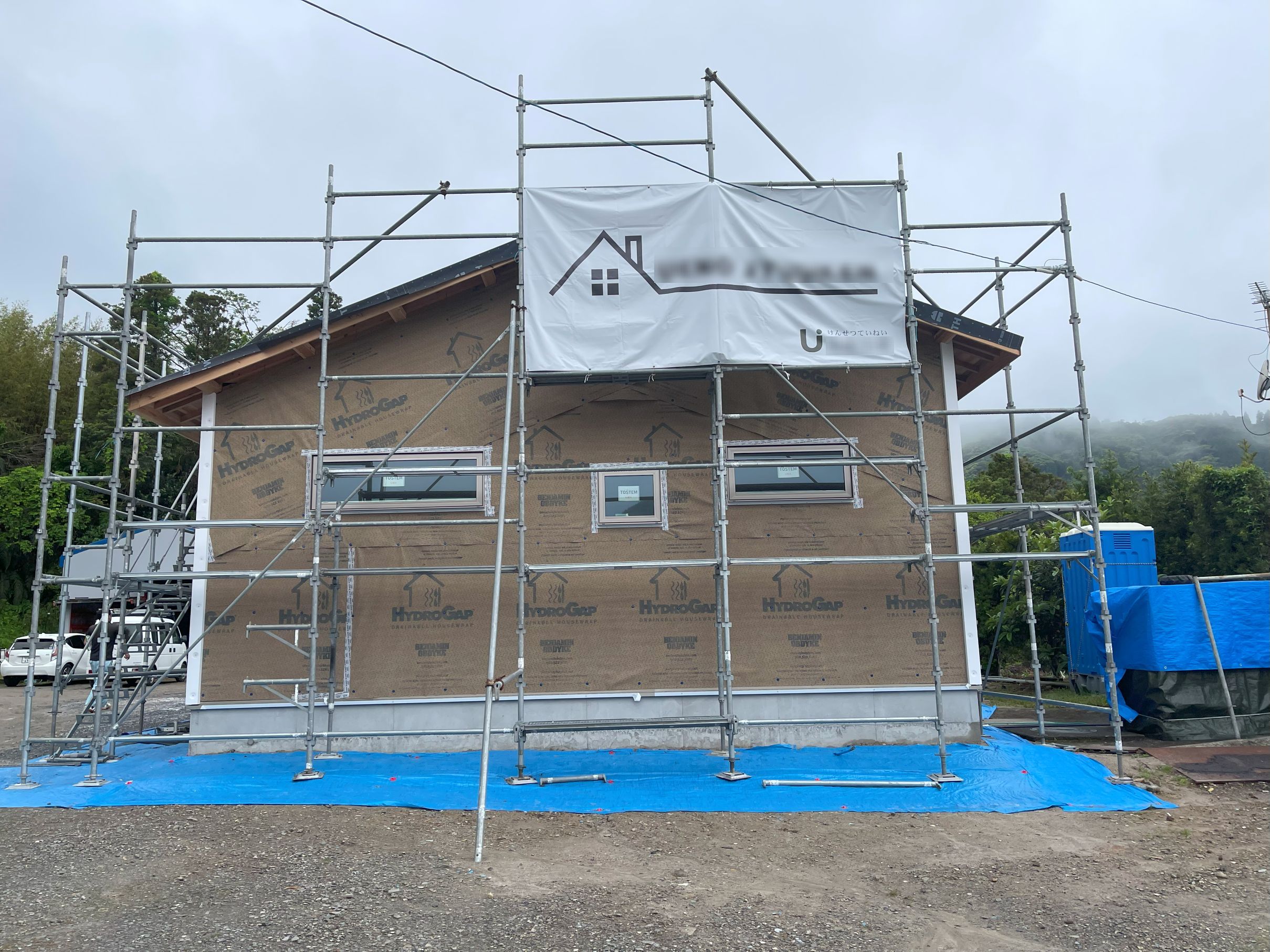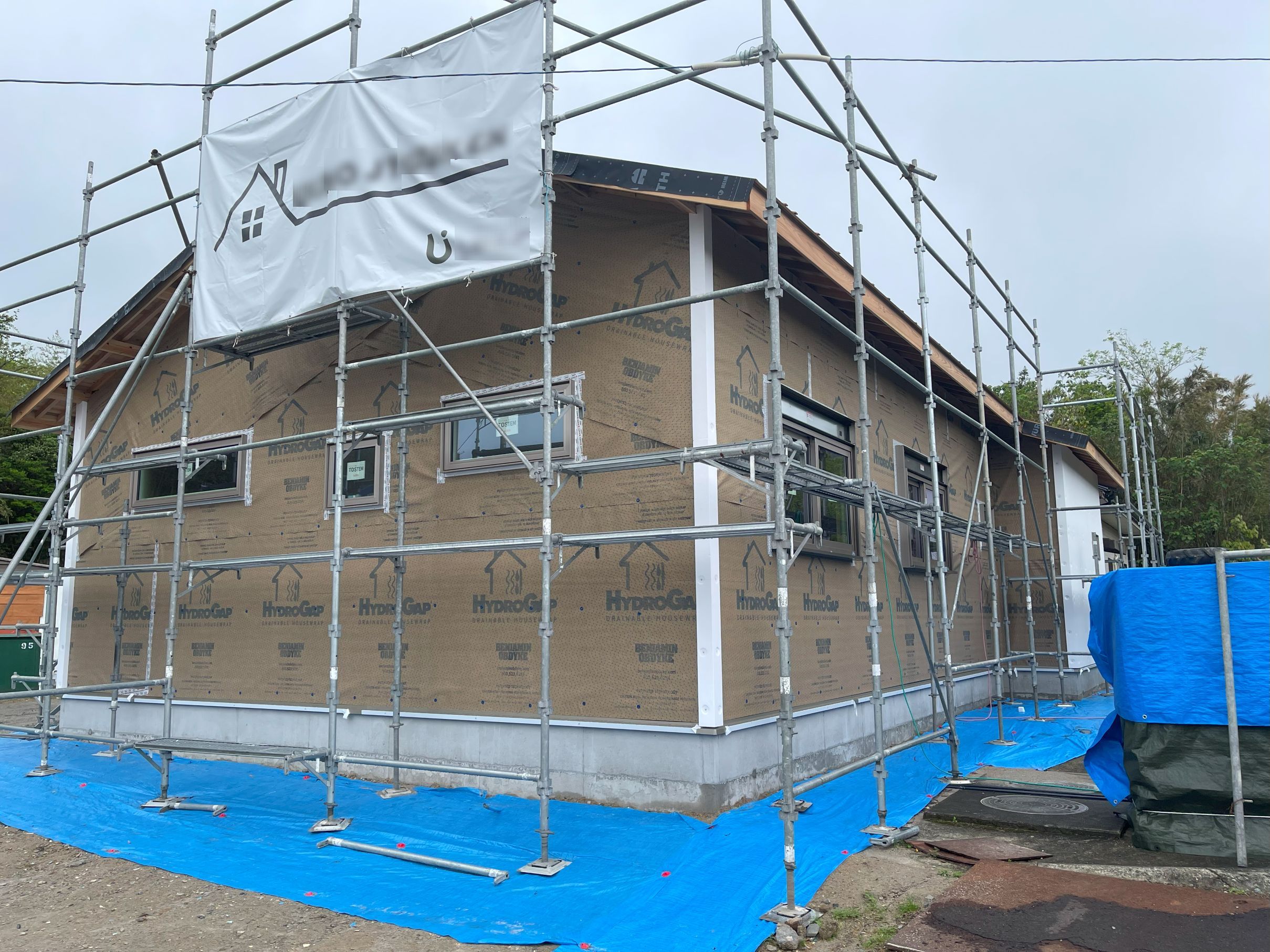 レインスクリーンラップの施工を終え、付加断熱材EPSの施工もかなりかなり進んだ現場。雨水が入り込み易い窓回りは、しっかりと防水施工がされています。
